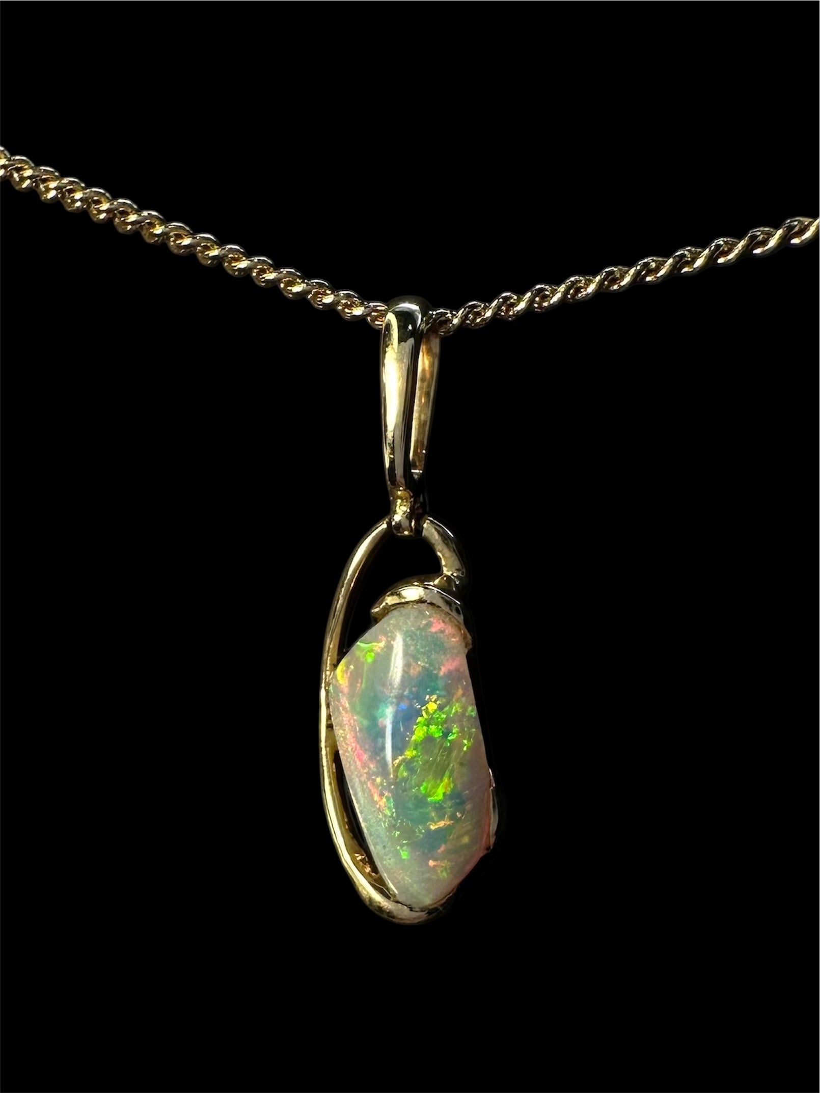 This exquisite pendant features a genuine Australian solid opal, renowned for its natural brilliance and unique play of colour, formed deep within the earth over millions of years. Set in luxurious 18ct gold, the bezel setting enhances the stone’s natural beauty while offering a sleek, timeless silhouette. A perfect blend of authenticity and elegance, this piece is designed to be treasured for a lifetime.