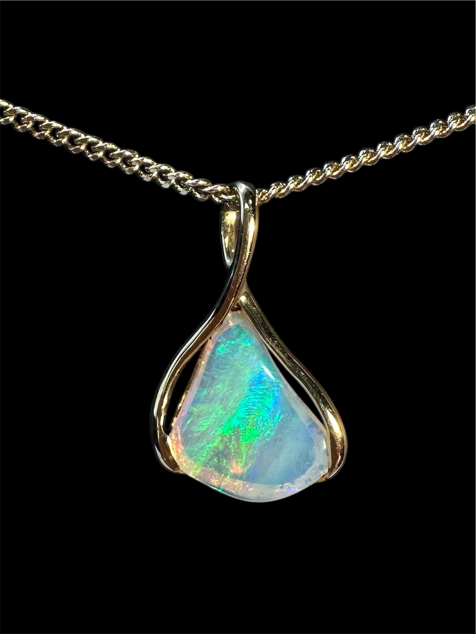 This exquisite pendant features a genuine Australian solid opal, renowned for its natural brilliance and unique play of colour, formed deep within the earth over millions of years. Set in luxurious 18ct gold, the bezel setting enhances the stone’s natural beauty while offering a sleek, timeless silhouette. A perfect blend of authenticity and elegance, this piece is designed to be treasured for a lifetime.