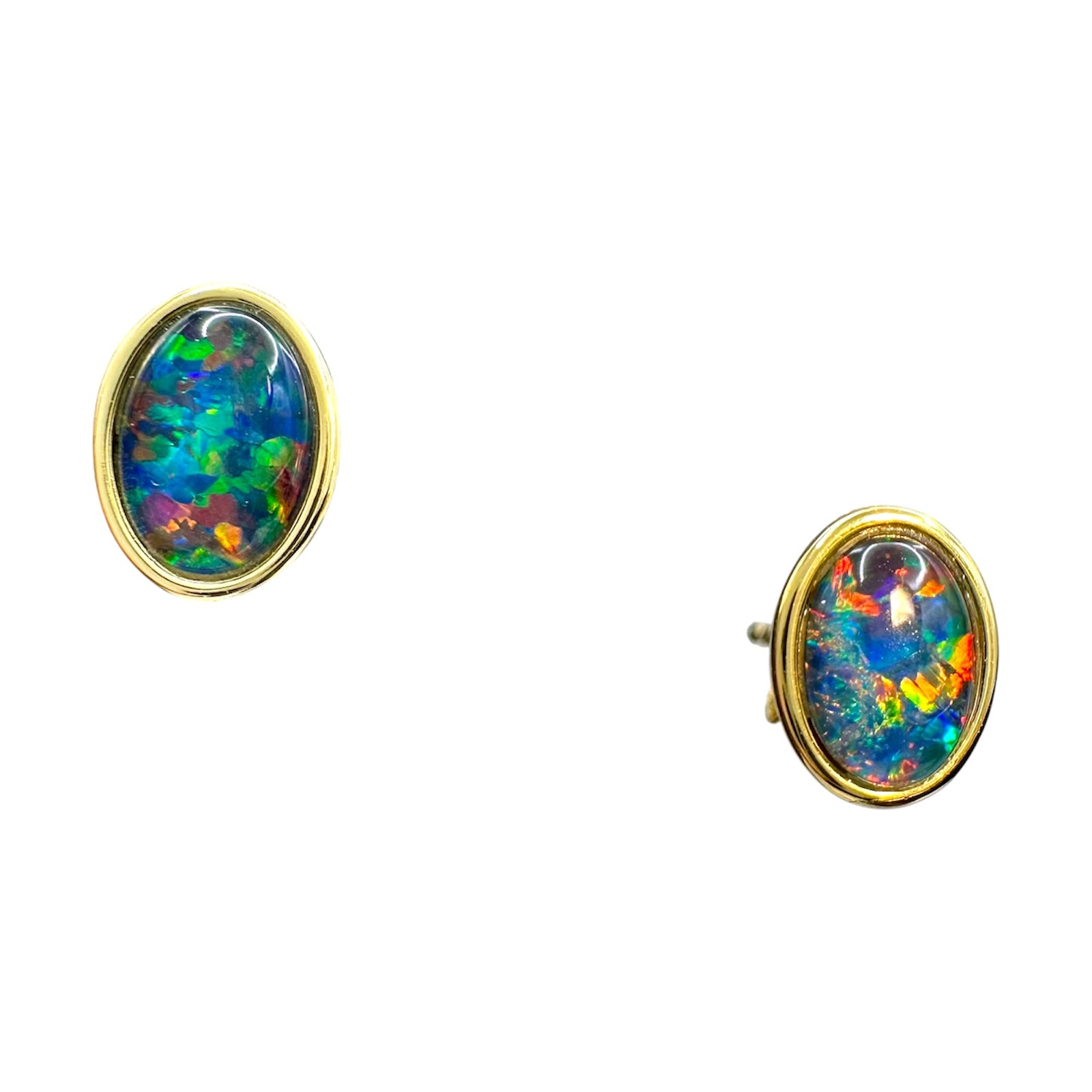 These gold plated triplet opal studs shimmer with vibrant flashes of colour, created by layering genuine Australian opal beneath a protective quartz cap. Set in a sleek gold-plated bezel, they combine the timeless warmth of gold with the natural brilliance of opal — perfect for adding a touch of elegance to any day.