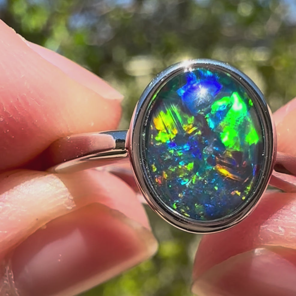This sterling silver triplet opal ring showcases vibrant flashes of colour, created by layering natural Australian opal beneath a protective quartz cap. Set in sleek 925 sterling silver, it offers a striking blend of durability, brilliance, and everyday elegance.
