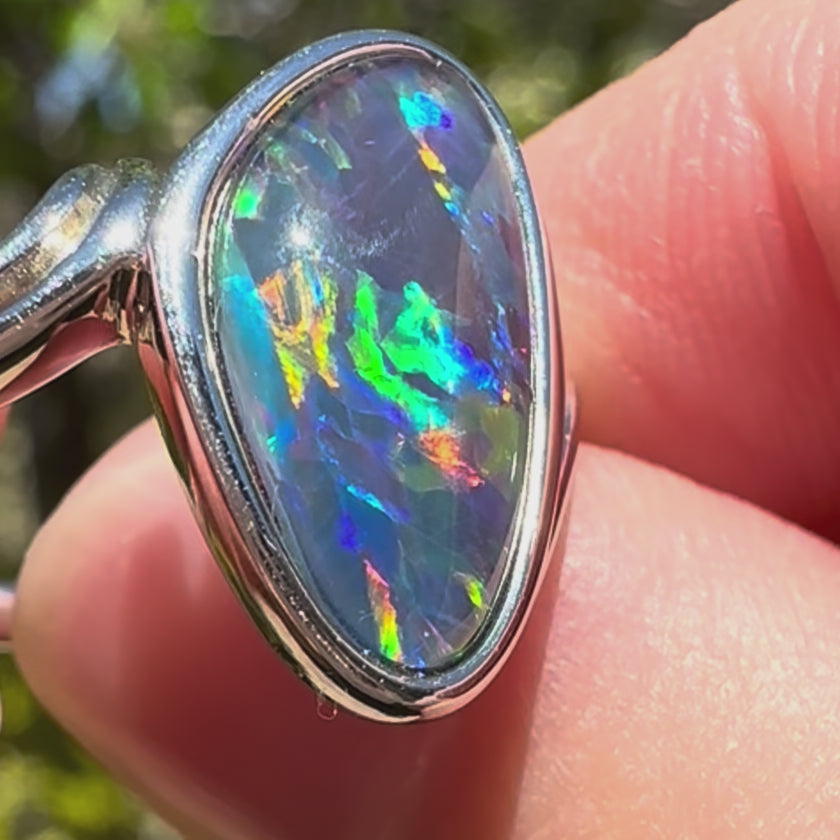 This sterling silver triplet opal ring showcases vibrant flashes of colour, created by layering natural Australian opal beneath a protective quartz cap. Set in sleek 925 sterling silver, it offers a striking blend of durability, brilliance, and everyday elegance.